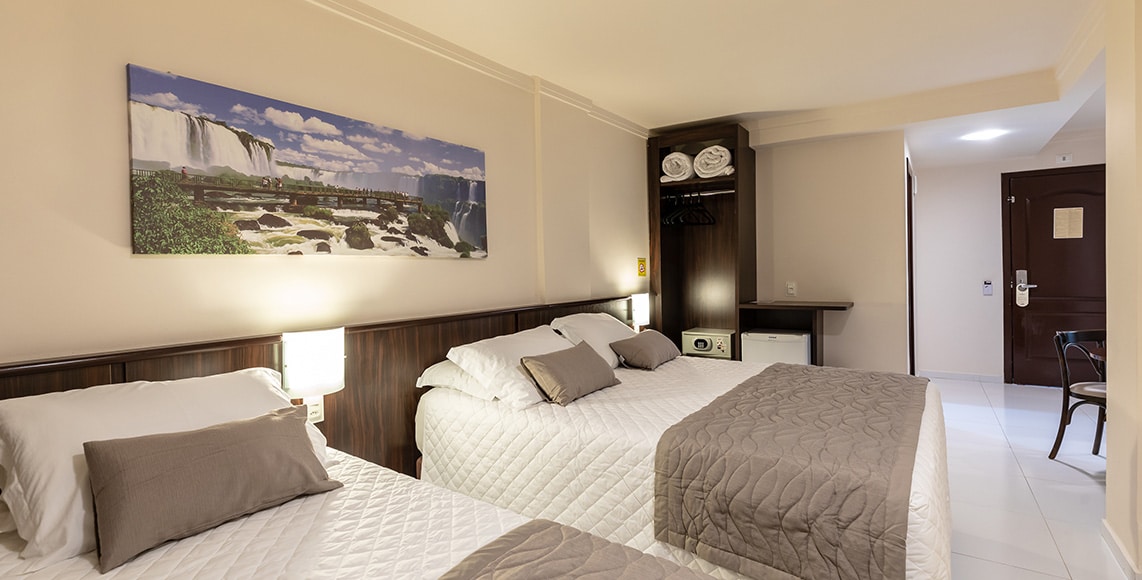 O Apartamento Triplo do Bogari Hotel é ideal para famílias com um filho ou para amigos que desejam compartilhar momentos de conforto em Foz do Iguaçu. Localizado na Avenida Brasil, no centro da cidade, o hotel oferece praticidade, segurança e fácil acesso a todos os atrativos turísticos da Terra das Cataratas.